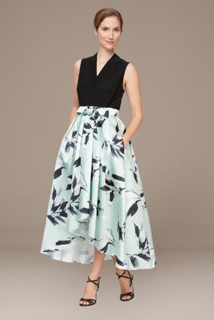 Perfect for the mother of the bride or groom, this modern dress features a sleeveless top and a pleated high-low mikado skirt. A tie belt cinches at the waist for an hourglass silhouette.