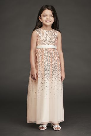 Sparkle alert! This sleeveless tulle flower girl dress is topped with tons of sequins that scatter down the full, floor-length skirt.