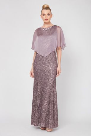 Get ready to make a stunning entrance in this sleeveless sequin lace sheath dress. An embellished asymmetrical capelet adds elegant dimension.