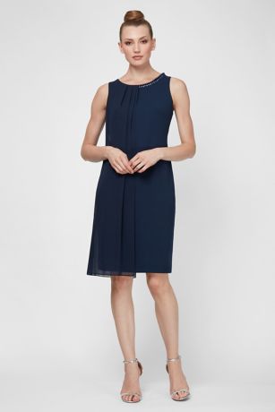 Topped with a drapey chiffon overlay and detailed with a beaded neckline, this short sheath dress is both elegant and fashionable.