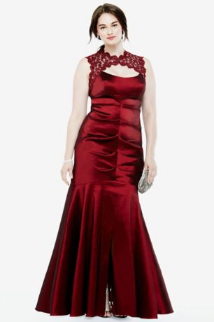 You can't help but look radiant in this shimmering taffeta trumpet dress with contrast lace details at the keyhole neckline.
