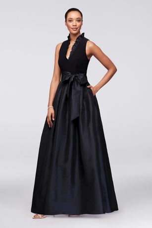 A ruffled stand-up collar and structured taffeta skirt with wide sash add a dose of sophistication to this mother of the bride ball gown.