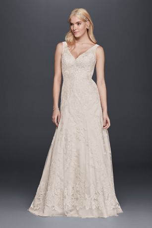 The illusion tank straps and beaded lace appliques on this tulle A-line wedding dress contribute a feminine quality to the classic and supremely flattering silhouette.