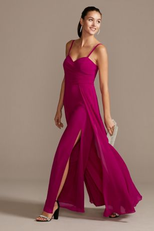 Make your entrance a wow moment in this spaghetti strap jumpsuit with a faux-wrap, pleated bodice paired with a billowy, wide-leg pant. Slits along the side of the pant peek out beneath the layered chiffon panels and provide movement with every step.