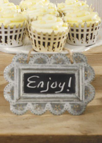 Embossed scalloped framing makes these tins signs extra special. Follow up with an equally special message written on the painted blackboard interior for a nice touch. Jute string included for easy hanging.