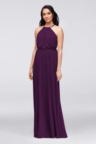 Soft, flowy, and versatile, this long mesh high-neck halter gown can be cinched with its waist-defining sash, or worn without for a loose and relaxed look.