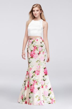 The clean lines and structured fabric of the simple crop top contrast neatly with the lustrous floral satin mermaid skirt.
