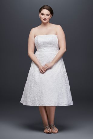 A simple silhouette perfect for a casual wedding or pre-wedding event, this textured lace tea-length dress is a beautiful blank slate to accessorize any way you wish.
