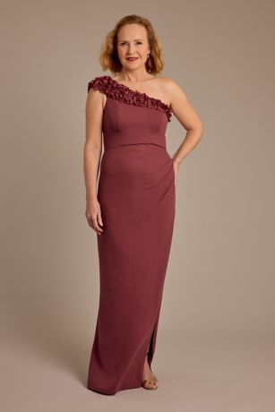 Delicate florals bloom from the one-shoulder neckline of this stunning crepe sheath dress. Mom will love the modern take on the silhouette, designed to show off her best assets.