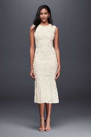 Slim-fitting and sleek, this stretch-infused sheath dress is intricately embellished with couture-inspired swirls of textural soutache ribbon. A perfect dress for the rehearsal dinner, or any event where you need a little extra flair.