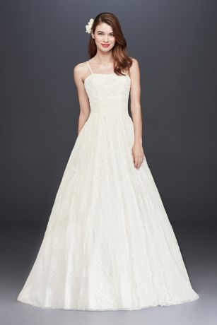 This playful allover lace ball gown is sweet and simple. Detailed with a pleated bodice and featuring convertible spaghetti straps, this effortless wedding dress is a blank canvas that awaits your personal touch.
