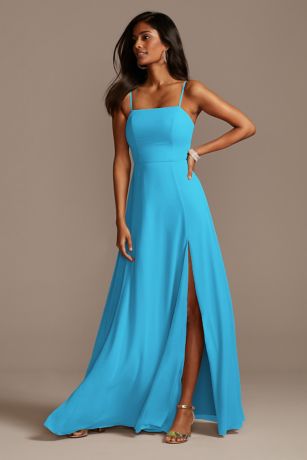 Easy to wear again and again, this chiffon bridesmaid dress will be a favorite of bridal parties and wedding guests alike for its timeless-yet-trendy style and its budget-friendly price. Features a modern, straight neckline, adjustable spaghetti straps and a skirt slit.