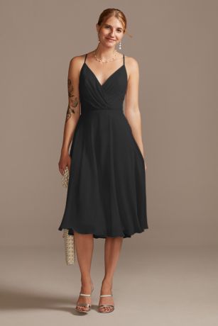 This below-the-knee chiffon bridesmaid dress gives an aura of dreamy romance from the softly pleated, plunging-V neckline to the soft, floaty skirt. The faux-wrap style bodice is matched with adjustable spaghetti straps to ensure the perfect fit.