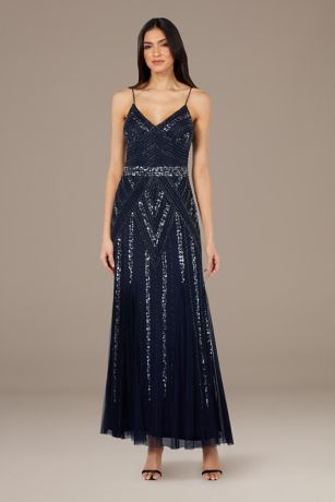 Deco-inspired beading makes this spaghetti strap prom dress glimmer.