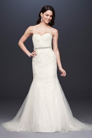 - Spaghetti strap trumpet gown features stunning lace applique detail that cascades down the sides for a dramatic, figure-enhancing look.