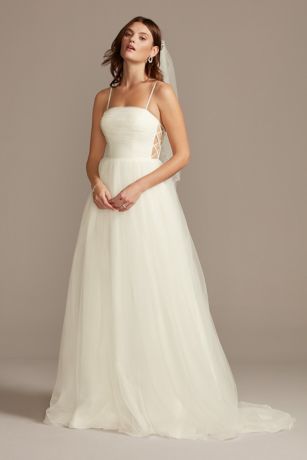 Romantic yet modern, this tulle wedding dress is detailed with a crisply pleated tulle bodice, beaded spaghetti straps, and lattice-motif side cutouts. Soft layers of tulle float down the A-line skirt to finish the look with dreamy flair.