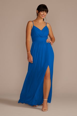 The bodice of this long, soft mesh bridesmaid dress is so delicate with slender spaghetti straps, elegant pleating, and a flattering ruched waistband. Adjustable straps provide the perfect fit.