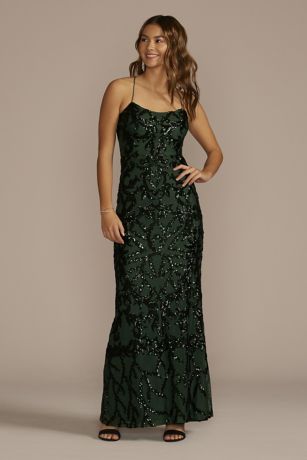 Glistening sequins add instant glamour to this spaghetti strap sheath dress that's perfect for prom. Amp up the drama with dazzling accessories.