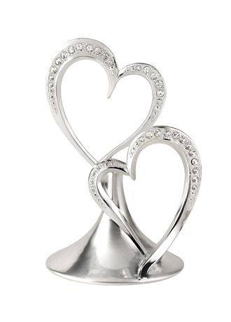 Embossed beading and sparkling rhinestones make this double heart cake top stunning. Cake topper is silver-plated and measures 5 1/2" tall with a 3 1/4" diameter base. Weight .42 lbs