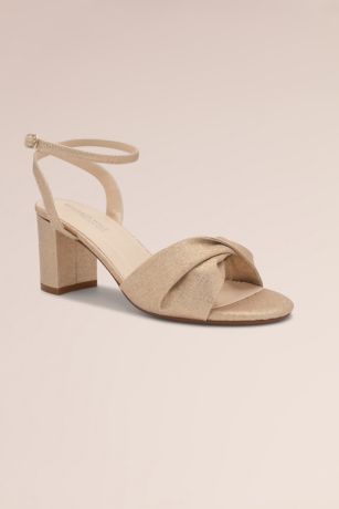 Fun and elegant, these twist strap block heel sandals catch the light with major sparkle.