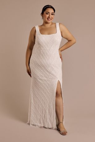 An exquisite sheath wedding dress, this square neckline gown stuns with intricate allover beading for a modern yet timeless bridal look.