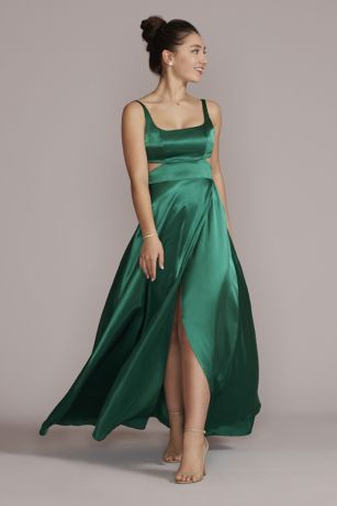 Captivating details come together to create one eye-catching ensemble, from satin-like charmeuse fabric to sexy side cutouts. The modern square neckline and flirty skirt slit complete the look.