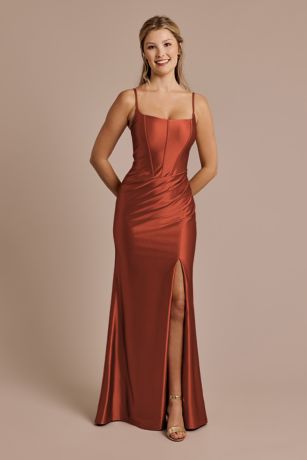 This glamorous sculpting satin mermaid dress highlights the figure with a square neckline and corset detailing on the bodice.