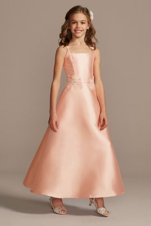 Crafted of lustrous mikado, this square-neck flower girl tank dress is adorned at the waist with intricate embroidery.
