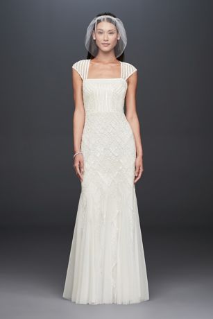 Channel the Roaring 20s in this cap-sleeved, flapper-inspired mesh sheath gown. Allover linear sequins and beading create texture and iridescent shine while the godet skirt gives the gown an airy feel.