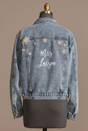 The perfect topper for a rehearsal dinner dress or reception look, this heavyweight denim jacket is studded with rhinestone stars. This modern heirloom is embroidered with Mrs., and ready to be personalized with the bride's last name.