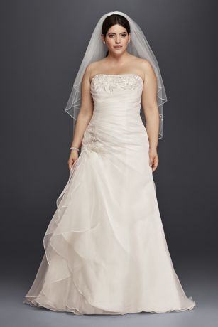Ruching has an unparalleled ability to contour curves while looking ultra-chic. This organza plus size wedding dress stuns thanks to multi-directional ruching and thoughtfully placed beaded lace appliques across the sweetheart neckline and hip.