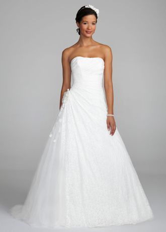 - Strapless gown features stunning lace ruched bodice for a truly spectacular look.