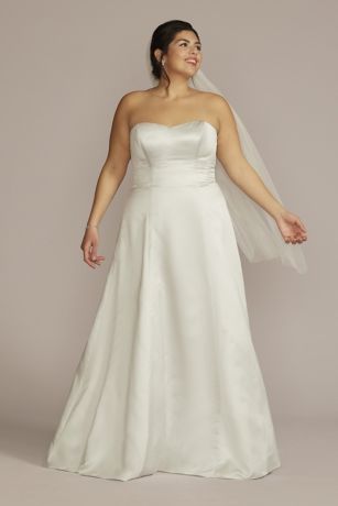 Keep your wedding look simple and stunning in a floor-length satin gown. The strapless bodice and A-line silhouette are universally flattering and scream bridal beauty.