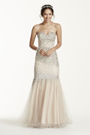 - Strapless sweetheart bodice features encrusted beaded detail for a sparkling effect.