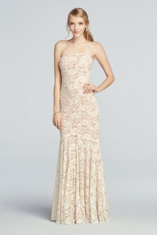 - Floor length dress features a nude lining with a chic floral lace overlay to create a subtle yet sultry Prom look.