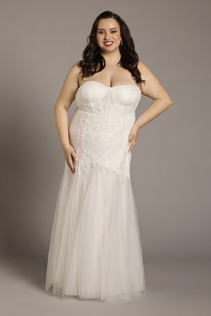 This strapless mermaid wedding dress features beaded lace detailing and hugs the body to create a stunning, figure-flattering silhouette with a touch of sparkle.