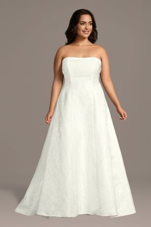 This strapless A-line wedding dress is crafted from rich brocade and features a clean, straight neckline for a timeless, structured look. The textured fabric adds subtle depth and elegance to the classic silhouette. The Edit by DB Studio is a modern, style-forward collection offering elevated looks for weddings and every RSVP.