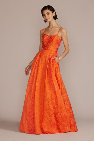 This gown combines a detailed brocade fabric with an elegant ball gown silhouette, creating something reminiscent of Old Hollywood.
