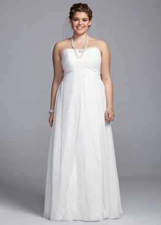 - Strapless chiffon A line gown features stunning ruched bodice.