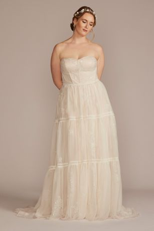 Embrace boho bridal vibes in a silky chiffon strapless wedding dress. The A-line silhouette is adorned with 150 organza petals, and each 3D flower applique is hand sewn into place for a truly ethereal look.