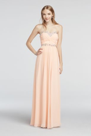 Perfectly pretty with plenty of sparkle, this beautiful chiffon dress is fit for a Prom Queen! Strapless sweetheart bodice features a mix of iridescent crystal beading for a much needed pop of glamorous sparkle, while the center knotted detail extends into soft, eye-catching pleats.