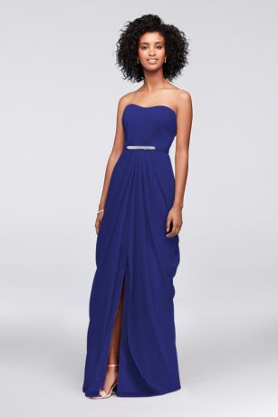 This strapless crinkle chiffon bridesmaid dress has a red-carpet-cool feel thanks to its crystal-topped beaded belt and drapey swag skirt.