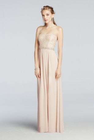 • Elegant strapless sweetheart bodice is fashioned from a trendy glitter lace for a little sparkle and shine.