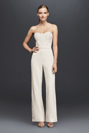 Looking for something a little different, and very chic? This long-and-lean crepe jumpsuit is the perfect ensemble for a modern, playful bride. Featuring hand-punched floral detailing on the bodice and a removable sash, this one-piece is suitable for all wedding events, from the engagement party to the rehearsal dinner to the big day itself.