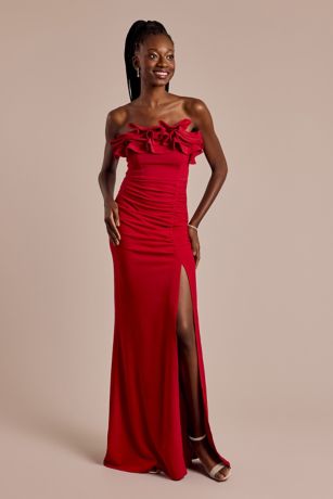 A dramatic ruffle and skirt slit combine for a va-va-voom moment on this strapless crepe sheath dress. It's a chic choice for your next event!