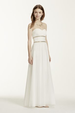 Timeless and elegant Grecian inspired dress, a look you will truly love! Strapless sweetheart bodice features two delicate strands of shining stones while the long flowing sheer matte skirt adds movement.