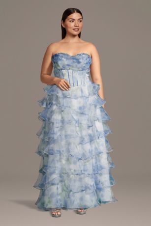 This strapless A-line dress features tiered organza layers in a vibrant floral print. Optional spaghetti straps let you customize your fit for prom or another special occasion.