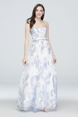 Dare to be different in this glamorous gown, layered with a glitter brocade pattern atop delicate tulle. The look is completed with a lace-up bodice and a crystal-style belt.