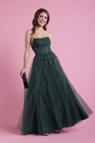 This showstopping strapless A-line design features an illusion bodice covered in sequin appliques, with optional strap for a custom fit. Perfect for prom night or another major moment.