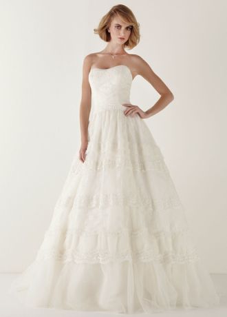 - Full tiered lace and tulle skirt adds flair, drama and dimension.